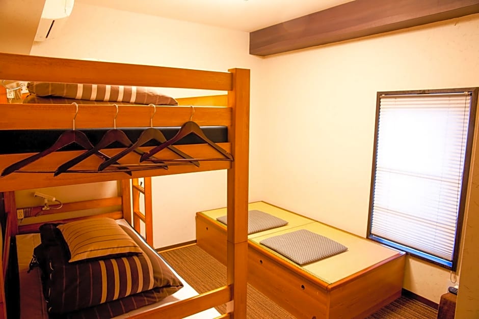 Room featuring a bunk bed and a Japanese-style seating area with tatami-mat flooring and sitting cushions. It's fitted with an air conditioning and an private bathroom with a shower and a bathtub. An extra bed will be prepared for a 3rd guest, only when the booking is made for 3 people. Please indicate the correct number of guests at time of booking.